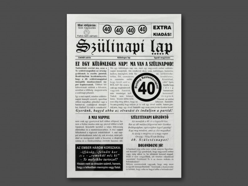 Születésnapi vicces újság. 8 oldal, mókás üzenetekkel és rejtvénnyel.