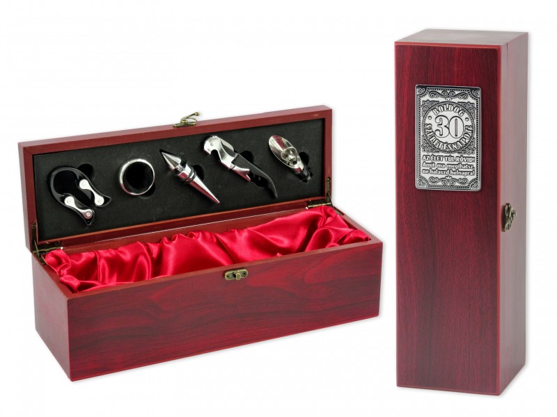 A készlet tartalma: bortartó doboz, dugóhúzó, cseppfogó, kiöntő, dugó, kupak tekerő.