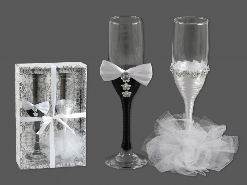 CQ01137 Esküvői pezsgőspohár 2db tollas fekete/fehér