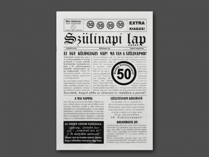 Születésnapi vicces újság. 8 oldal, mókás üzenetekkel és rejtvénnyel.